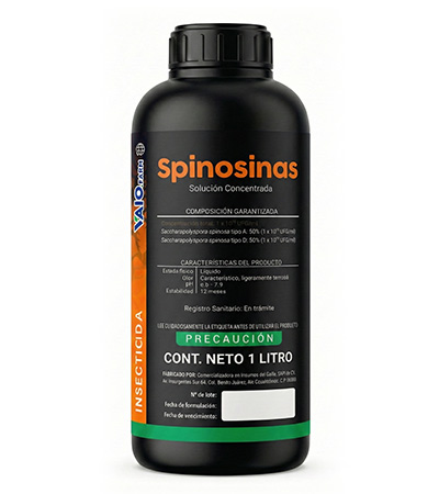 Insecticida que utiliza metabolitos activos (espinosinas A y D de Saccharopolyspora spinosa) para un control eficaz de plagas resistentes (trips, minadores, orugas, ácaros) actuando por ingestión y contacto en el sistema nervioso.
