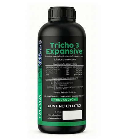 Fungicida con un consorcio de Trichoderma spp. (harzianum, reesei, viride) que actúa por biocontrol, micoparasitismo y estimulación de la resistencia sistémica.